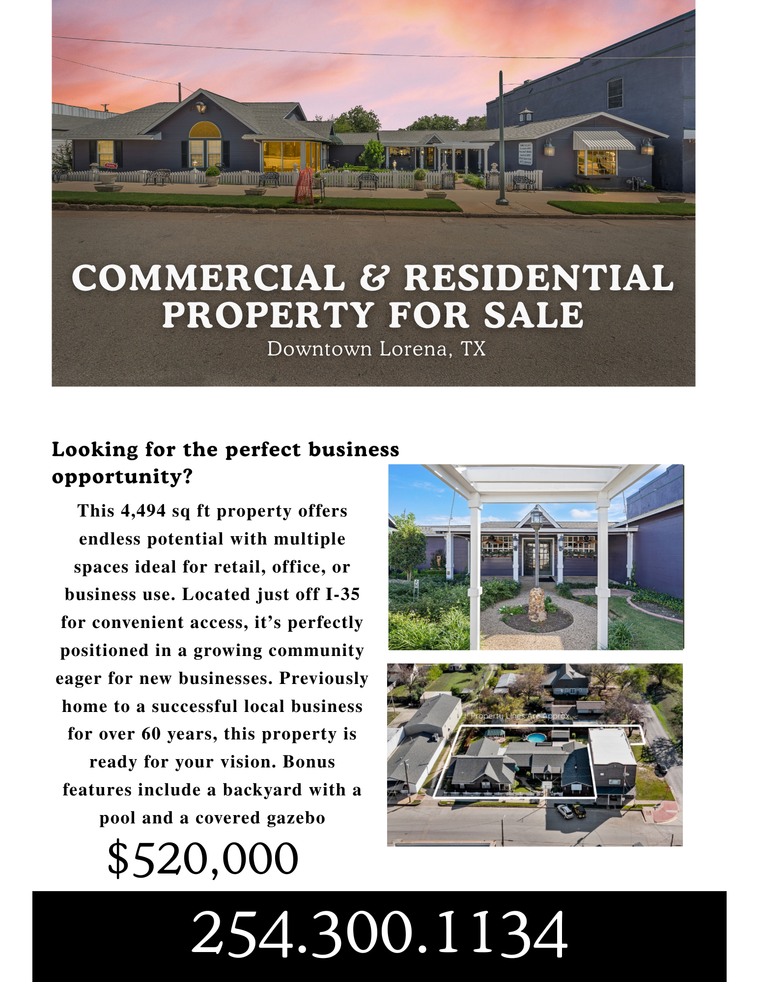 Great opportunity in historic Downtown Lorena! This 4,494 sq ft property offers endless potential with multiple spaces ideal for retail, office, or business use. Located just off I-35 for convenient access, it's perfectly positioned in a growing community eager for new businesses. Previously home to a successful local business for over 60 years, this property is ready for your vision. Bonus features include a backyard with a pool and covered gazabo - perfect for relaxing evenings and beating the Texas heat. Don't miss out - schedule your private showing today! 254.300.1134